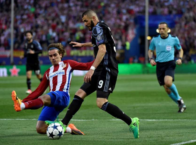 - © 2017 AFP | Crée le 11.05.2017 à 19h03 | Mis à jour le 11.05.2017 à 19h05ImprimerL'attaquant français du Real Madrid Karim Benzema (d) et son compatriote de l'Atletico Madrid Antoine Griezmann, lors de la demi-finale retour de la Ligue des Champions 2016-2017, à Madrid, le 10 mai 2017 GERARD JULIEN-AFP
