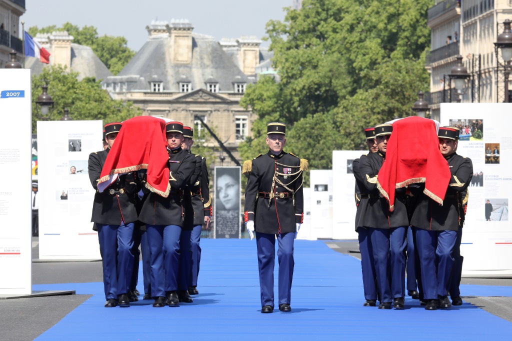 Les deux cercueils recouverts du drapeau français sont entrés par le portail monumental du Panthéon en présence du président et de son épouse Brigitte, des deux fils encore vivants du couple Veil et de leurs descendants, au son d'un solo de violoncelle de la suite numéro 5 de Jean Sébastien Bach.