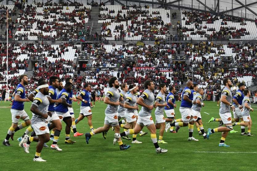 - © 2017 AFP | Crée le 17.06.2017 à 07h18 | Mis à jour le 17.06.2017 à 07h20ImprimerLes joueurs de Toulon et La Rochelle à l'échauffement au stade Vélodrome de Marseille, le 26 mai 2017 BORIS HORVAT-AFP/Archives