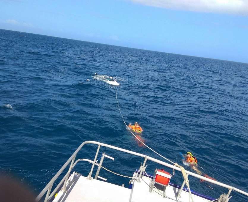 Le MRCC sollicite aussitôt les Sauveteurs en mer et envoie un « mayday relay » sur les ondes à l'attention des bateaux qui seraient sur zone afin de porter secours aux naufragés. C'est un taxi-boat qui naviguait dans le secteur qui arrive le premier sur le lieu du naufrage et récupère les six plaisanciers malheureux - équipés de leur gilet de sauvetage - du côté de l'îlot Redika.Les naufragés ont été pris en charge quinze minutes plus tard par les Sauveteurs en mer et ramenés sur la terre ferme, sains et saufs, avec la vedette Nautile.