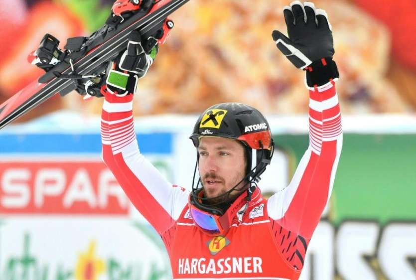 - © 2018 AFP | Crée le 21.12.2018 à 00h27 | Mis à jour le 21.12.2018 à 00h30ImprimerL'Autrichien Marcel Hirscher bras levés dans l'aire d'arrivée après avoir remporté le slalom de Saalbach en Autriche, le 20 décembre 2018 BARBARA GINDL-APA/AFP