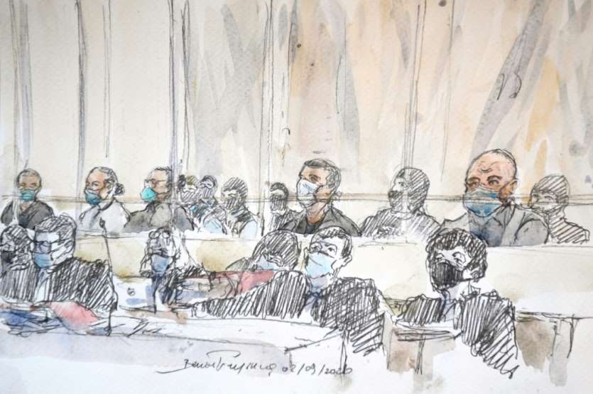 - © 2020 AFP | Crée le 03.09.2020 à 23h41 | Mis à jour le 03.09.2020 à 23h45ImprimerCroquis d'audience montrant les accusés et leurs avocats, lors de l'ouverture du procès des attentats de janvier 2015, le 2 septembre 2020 à Paris Benoit PEYRUCQ-AFP