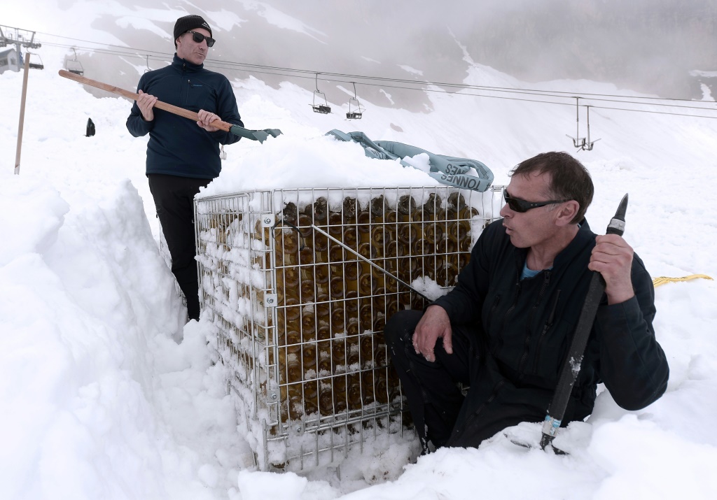 "Ça y est, on les a enfin sorties !": à coups de pelle, le vigneron bordelais Franck Labeyrie a longuement creusé avec plusieurs pisteurs d'une station de ski pyrénéenne pour récupérer son trésor, des bouteilles de vin enfouies dans la neige à 2.400 mètres d'altitude.