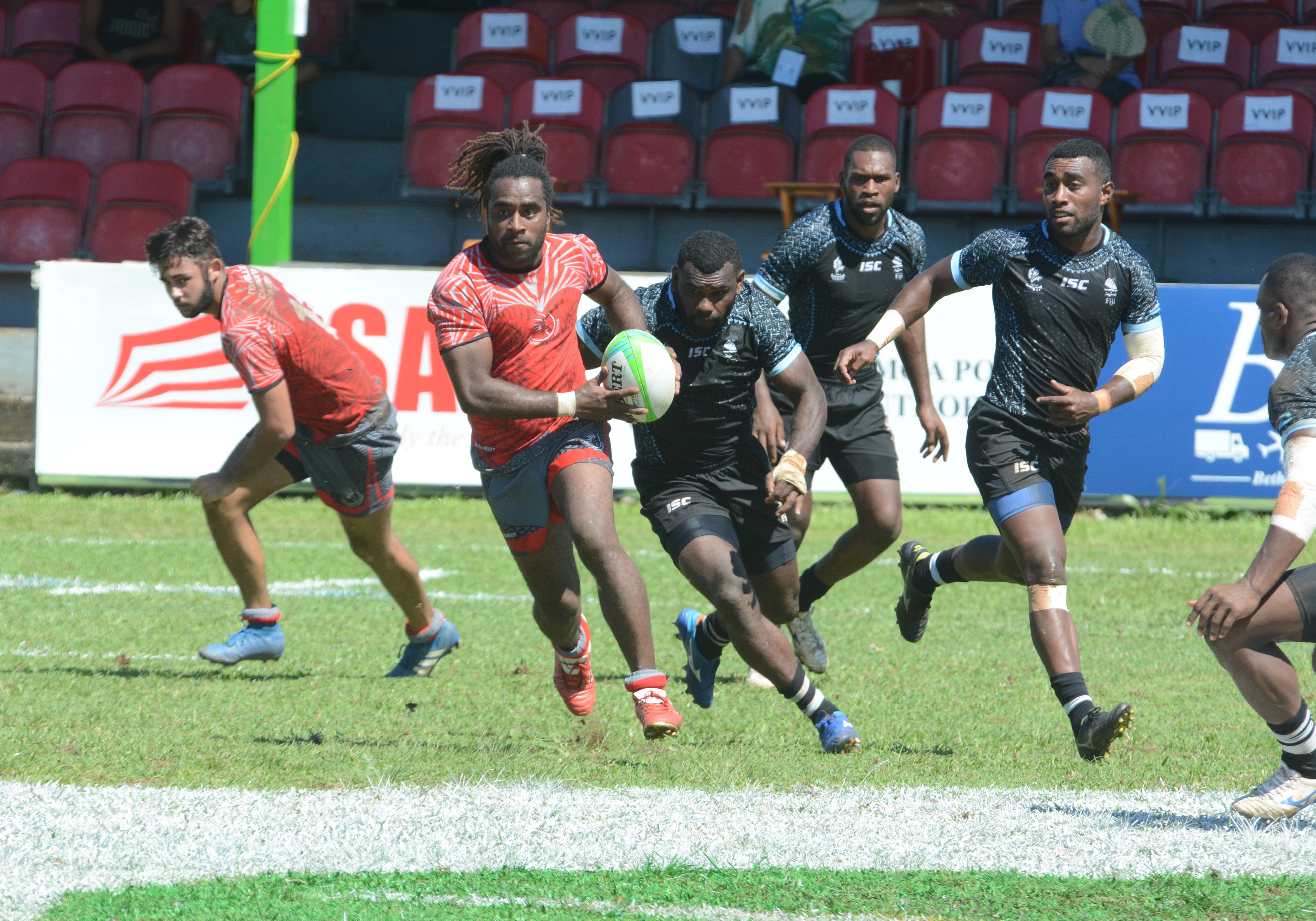 L’après-midi, dans la première opposition de l’histoire des Jeux entre la Calédonie et Wallis-et-Futuna, les hommes de Sanua Manuopuava, menés 0-10 puis sanctionnés d’un carton jaune, ont répliqué en plantant trois essais par l’intermédiaire de Bell Palasso (en photo, ballon en main), d’Emmanuel Roche et d’Ismaël Motuku pour s’imposer 21-15.