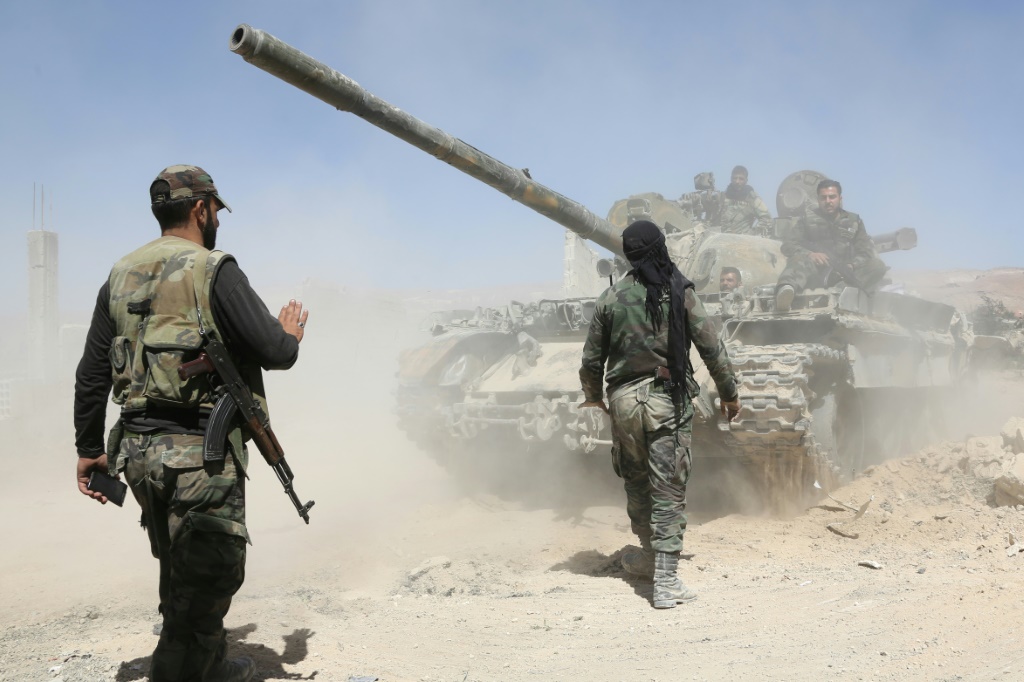- © 2018 AFP | Crée le 08.04.2018 à 20h27 | Mis à jour le 08.04.2018 à 20h30ImprimerLes forces prorégime avancent en direction de Douma, dernière poche rebelle aux portes de Damas, le 7 avril 2017 STRINGER-AFP