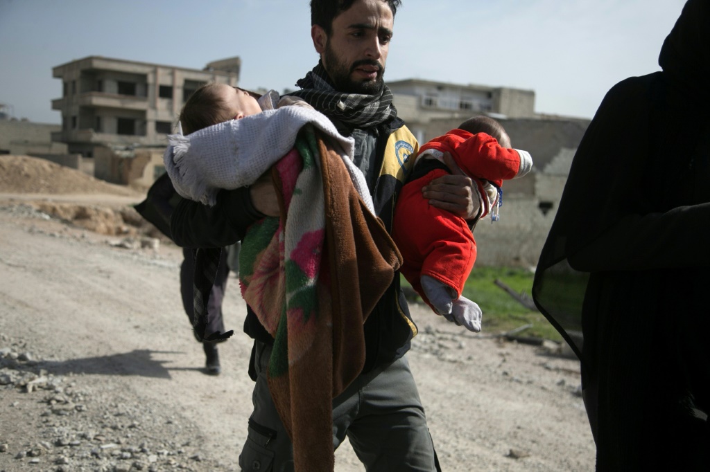 - © 2018 AFP | Crée le 05.03.2018 à 14h03 | Mis à jour le 05.03.2018 à 14h05ImprimerUn secouriste des Casques blancs emmène des enfants hors de la localité de Hammouriyé, dans la Ghouta orientale, le 4 mars 2018 ABDULMONAM EASSA-AFP