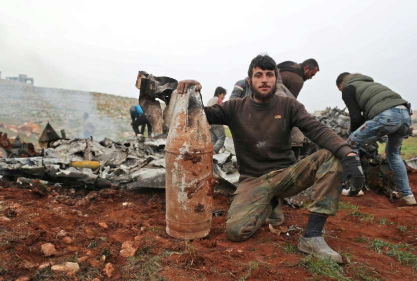 - © 2020 AFP | Crée le 15.02.2020 à 02h11 | Mis à jour le 15.02.2020 à 02h15ImprimerUn rebelle syrien pose avec un débris d'un hélicoptère de l'armée syrienne abattu, dans la province d'Alep (Syrie), le 14 février 2020 Omar HAJ KADOUR-AFP