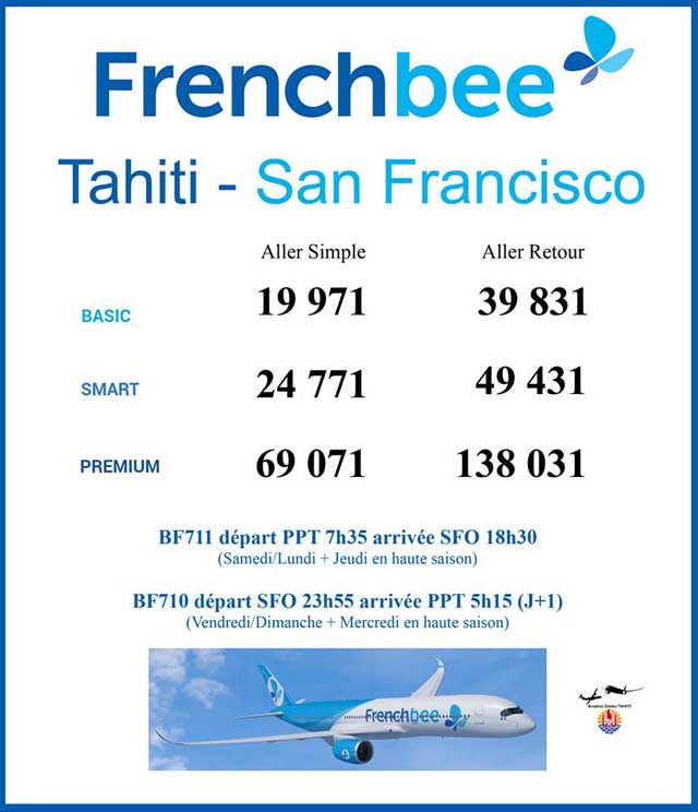 Avec des tarifs d’appel près de 40% moins chers que ceux des compagnies Air Tahiti Nui et Air France vers les Etats-Unis, la compagnie aérienne French Bee (ex-French Blue) va relancer la concurrence sur la ligne Papeete-San Francisco avec un aller simple à partir de 19 971 francs, selon Aviation Geeks Tahiti. Le détail, ci-après, des différents tarifs :