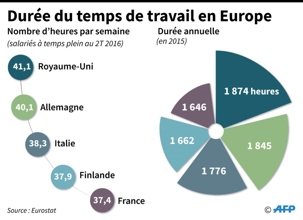 Si l'on prend pour référence le nombre d'heures travaillées par semaine des salariés à temps plein, la France est en queue de peloton avec 37,4 heures en moyenne au deuxième trimestre 2016, selon les statistiques de l'Institut européen Eurostat. La Finlande est à 37,9 heures, l'Italie 38,3, l'Allemagne 40,1 et le Royaume-Uni 41,1 heures.