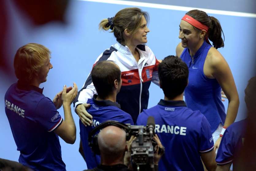 - © 2016 AFP | Crée le 15.11.2016 à 02h20 | Mis à jour le 15.11.2016 à 02h25ImprimerAmélie Mauresmo (g), capitaine de l'équipe de France de Fed Cup, félicite Caroline Garcia lors de la finale face à la République tchèque, le 13 novembre 2016 à Strasbourg PATRICK HERTZOG-AFP