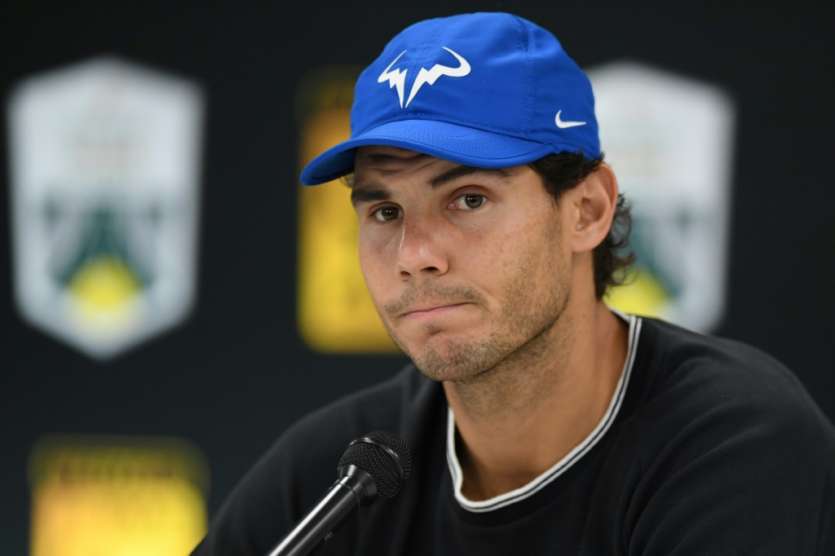 - © 2017 AFP | Crée le 04.11.2017 à 04h28 | Mis à jour le 04.11.2017 à 04h30ImprimerL'Espagnol Rafael Nadal annonce son forfait avant les quarts du tournoi de Paris-Bercy en raison d'une blessure à un genou, lors d'une conférence de presse le 3 novembre 2017 CHRISTOPHE ARCHAMBAULT -AFP