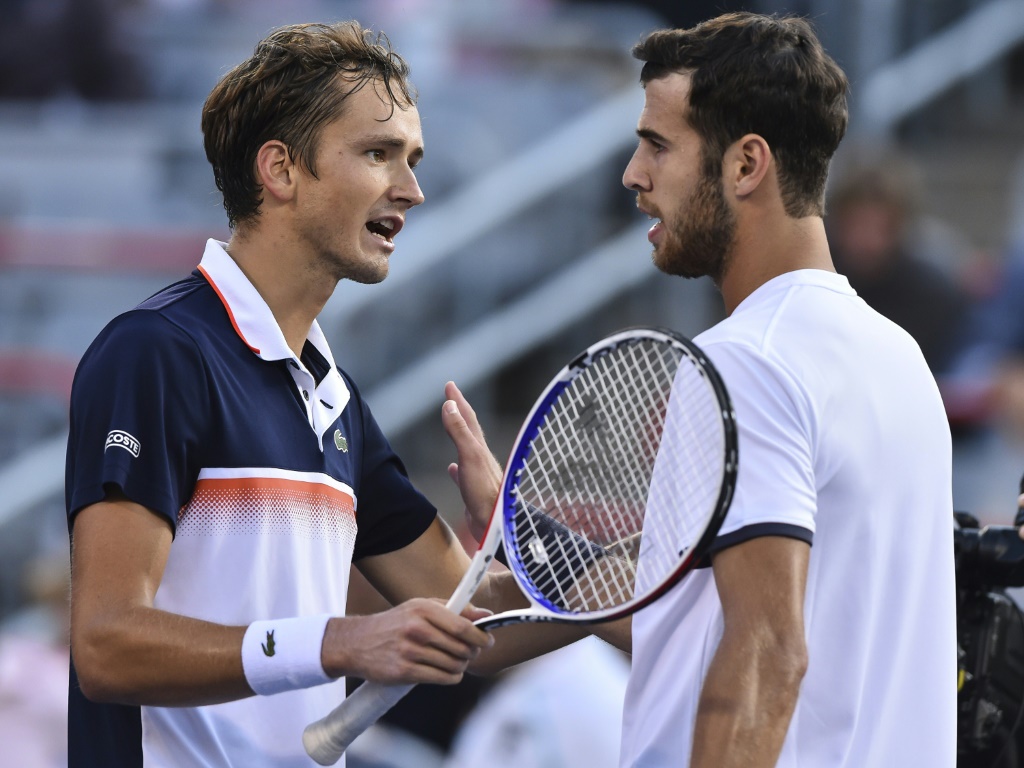 - © 2019 AFP | Crée le 11.08.2019 à 15h58 | Mis à jour le 11.08.2019 à 16h00ImprimerLe Russe Daniil Medvedev (g) congratule son compatriote Karen Khachanov après l'avoir battu en demi-finales du Masters 1000 de Montréal, le 10 août 2019 Minas Panagiotakis-Getty/AFP