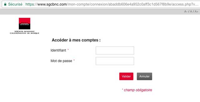 En y regardant de plus près, on voit que l'adresse de cette page internet est « www.sgcbnc.com » (avec toute une série de caractères) au lieu de « www.sgcb.nc ».