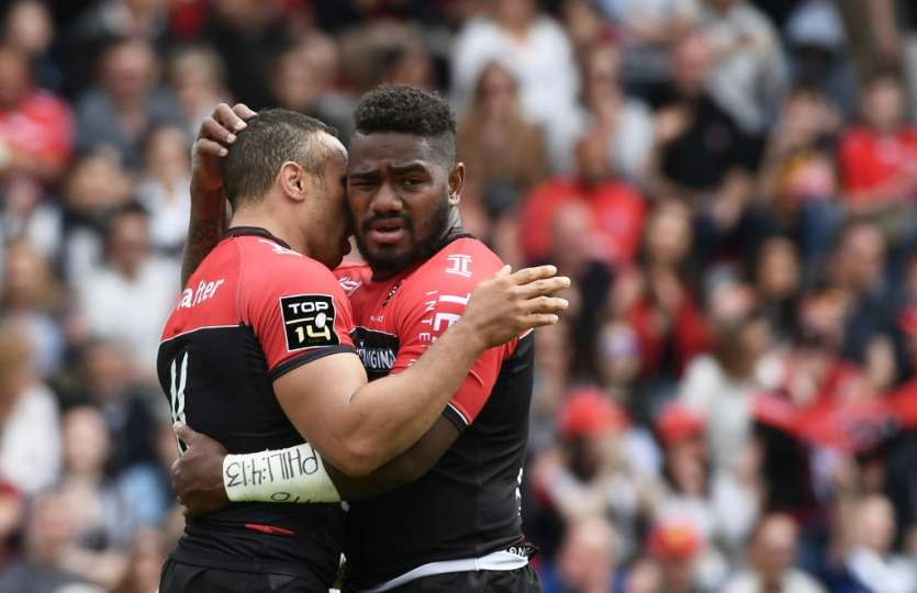 - © 2017 AFP | Crée le 16.04.2017 à 02h45 | Mis à jour le 16.04.2017 à 02h50ImprimerL'ailier de Toulon Josua Tuisova (d) est congratulé par son équipier Bryan Habana après avoir marqué un essai face à Castres, le 15 avril 2017 à Toulon ANNE-CHRISTINE POUJOULAT-AFP