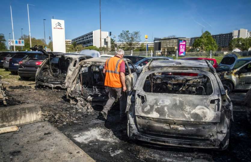 - © 2018 AFP | Crée le 19.04.2018 à 07h54 | Mis à jour le 19.04.2018 à 07h55ImprimerDes carcasses de voitures carbonisées à Toulouse le 18 avril 2018 ERIC CABANIS-AFP