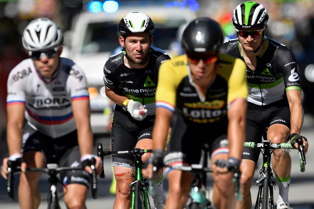 - © 2017 AFP | Crée le 05.07.2017 à 08h54 | Mis à jour le 05.07.2017 à 08h55ImprimerLe Britannique Mark Cavendish (2g), blessé, franchit la ligne d'arrivée de la 4e étape du Tour de France, le 4 juillet 2017 à Vittel Jeff PACHOUD-AFP