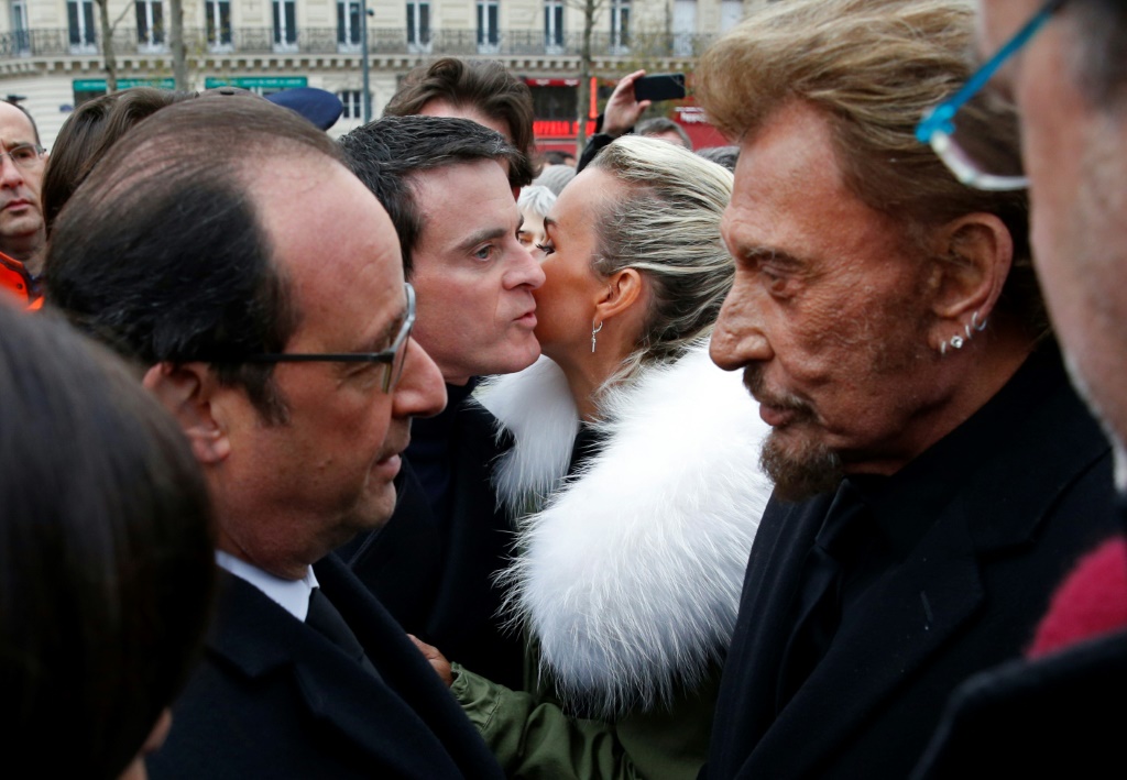 - © 2017 AFP | Crée le 06.12.2017 à 19h46 | Mis à jour le 06.12.2017 à 19h50ImprimerLe président Francois Hollande parle avec Johnny Hallyday tandis que sa femme Laetitia embrasse le Premier ministre Manuel Valls à la fin d'une cérémonie le 10 jancier 2016, un an après l'attentat contre Charlie Hebdo PHILIPPE WOJAZER-POOL/AFP/Archives