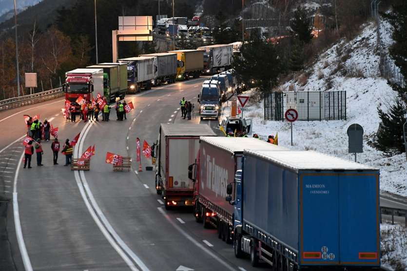 Dès 06H00, à Modane, en Savoie, des routiers ont commencé à bloquer avec des palettes l'accès des camions au tunnel du Fréjus, axe majeur vers l'Italie. Vers 08H00, 180 camions étaient bloqués sur un parking en amont.