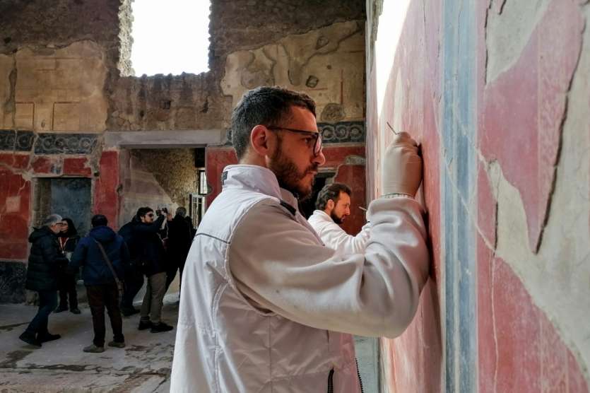 Nombre des fresques de ces domus étaient recouvertes depuis des dizaines d'années par une épaisse couche de saleté. "Il faut faire attention à ne pas tout enlever. Il faut travailler pas à pas", a expliqué à l'AFP l'un des restaurateurs présents sur place, Aldo Guida, en grattant minutieusement la surface d'un mur du fameux "rouge Pompéi" de la "Maison des chastes amants".