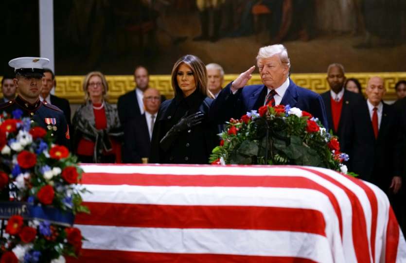 Le président américain Donald Trump est venu rendre un bref hommage lundi soir à son prédécesseur républicain George Herbert Walker Bush, dont le cercueil, drapé des couleurs américaines, est exposé pour un hommage public solennel au Capitole, à Washington.