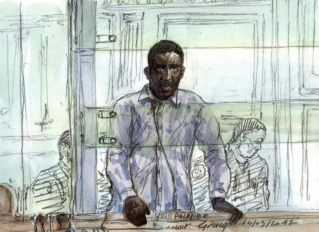 - © 2017 AFP | Crée le 30.03.2017 à 01h45 | Mis à jour le 30.03.2017 à 01h50ImprimerCroquis d'audience qui montre Yoni Palmier, le jour d'ouverture de son procès d'appel au Palais de Justice de Paris, le 14 mars 2017 Benoit PEYRUCQ-AFP/Archives