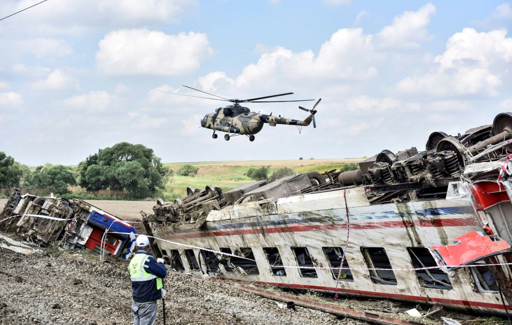 - © 2018 AFP | Crée le 09.07.2018 à 21h01 | Mis à jour le 09.07.2018 à 21h05ImprimerUn hélicoptère survole le 9 juillet 2018 le site où un train a déraillé dans la région de Tekirdag en Turquie DHA-DHA/AFP