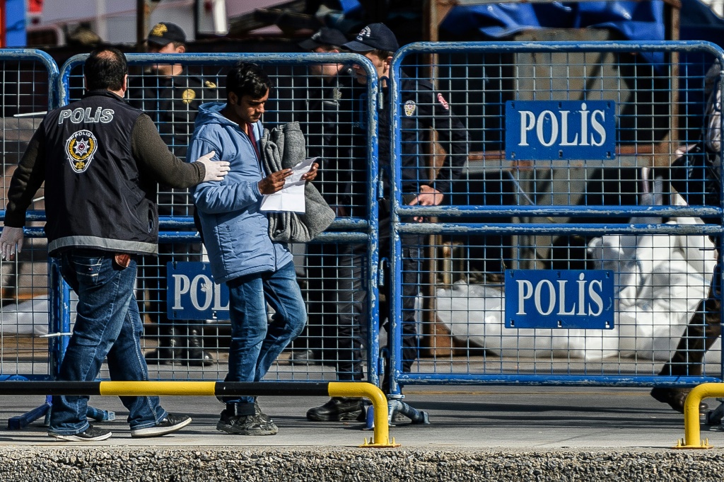 - © 2016 AFP | Crée le 25.11.2016 à 20h01 | Mis à jour le 25.11.2016 à 20h05ImprimerUn policier turc accompagne un migrant rapatrié depuis la Grèce à son arrivée au port d'Izmir, le 4 avril 2016 OZAN KOSE-AFP/Archives