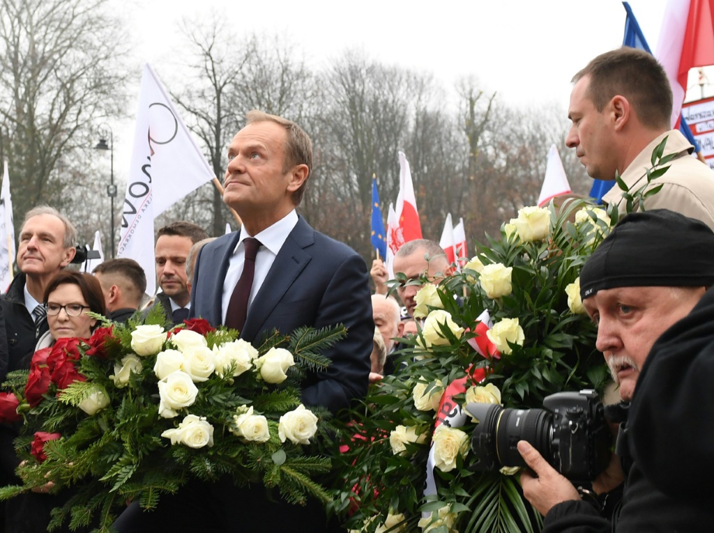 - © 2018 AFP | Crée le 11.11.2018 à 21h39 | Mis à jour le 11.11.2018 à 21h40ImprimerLe président du conseil européen Donald Tusk lors d'un dépôt de gerbe au monument du maréchal Jozef Pilsudski, père de l'indépendance polonaise, à Varsovie, le 11 novembre 2018 Janek SKARZYNSKI-AFP