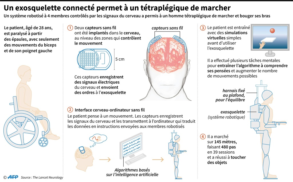 Chez les paralysés des quatre membres suite à une fracture de la colonne vertébrale, "le cerveau est toujours capable de générer les ordres qui habituellement font bouger les bras et les jambes, mais il n'y a personne qui les exécute", poursuit le spécialiste de neurochirurgie, auteur principal d'une étude publiée vendredi dans The Lancet Neurology.