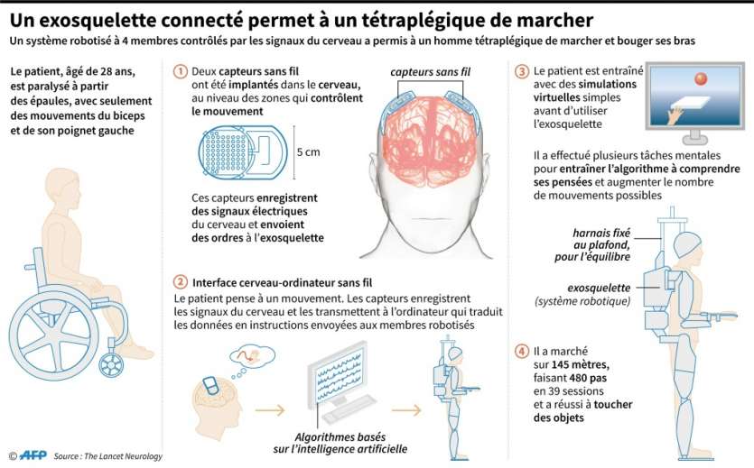 - © 2019 AFP | Crée le 04.10.2019 à 17h18 | Mis à jour le 04.10.2019 à 17h20ImprimerUn exosquelette connecté pour permettre à un tétraplégique de marcher Paz PIZARRO, Alain BOMMENEL-AFP
