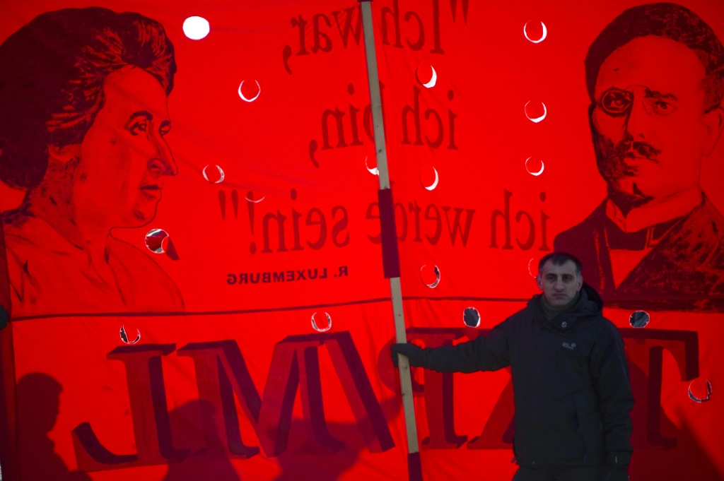 - © 2019 AFP | Crée le 13.01.2019 à 18h46 | Mis à jour le 13.01.2019 à 18h50ImprimerUne banderole représentant Rosa Luxemburg et Karl Liebknecht, le 15 janvier 2012 à Berlin Odd ANDERSEN-AFP/Archives
