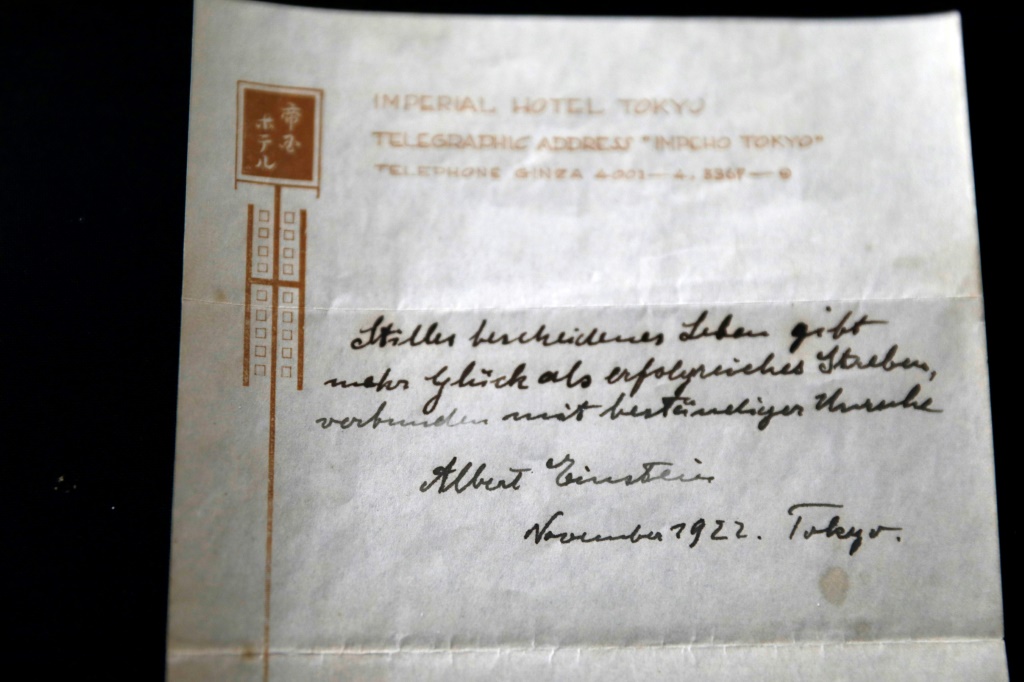 - © 2017 AFP | Crée le 25.10.2017 à 03h38 | Mis à jour le 25.10.2017 à 03h40ImprimerUne des notes écrites par Albert Einstein en 1922 sur du papier à lettres de l'Imperial Hotel à Tokyo, photographiée à Jérusalem le 19 octobre 2017 MENAHEM KAHANA-AFP/Archives