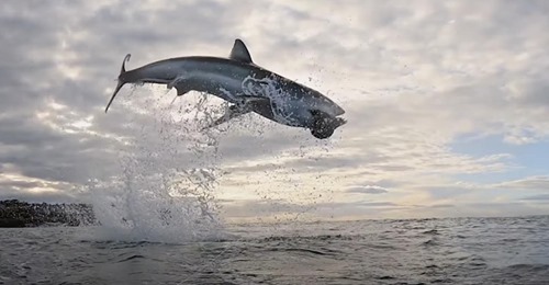 La séquence est rarissime. Elle a été tournée par une équipe de l'émission Air Jaws à proximité de Seal Island (L'île aux phoques), dans une baie de la ville du Cap, en Afrique du Sud, et diffusée sur la chaîne Discovery. On y voit un grand requin blanc faire un saut à plus de quatre mètres au-dessus de la surface en utilisant une technique de chasse particulière : le breaching.