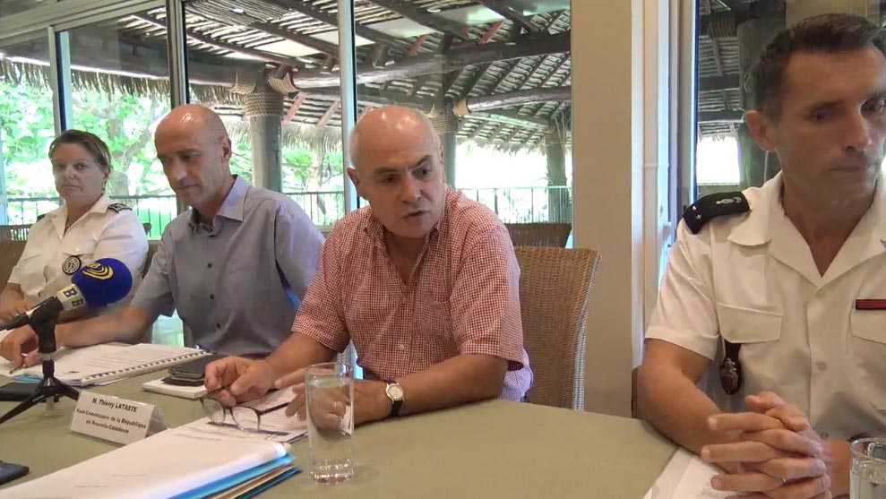 - | Crée le 22.02.2019 à 15h30 | Mis à jour le 22.02.2019 à 16h46ImprimerDe gauche à droite : la commissaire divisionnaire Sandrine Carlin, directrice adjointe de la direction de la sécurité publique (police nationale), Alexis Bouroz, procureur de la République de Nouméa, Thierry Lataste, haut-commissaire de la République et général Christophe Marietti, commandant de la gendarmerie nationale.