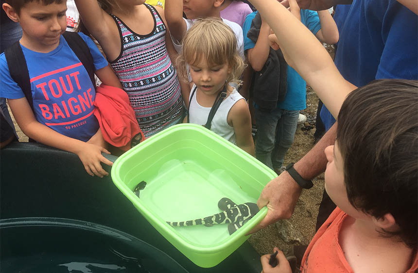 Ces neuf requinaux sont nés et ont grandi dans les bassins de l'aquarium, où les visiteurs ont pu observer leur développement embryonnaire.