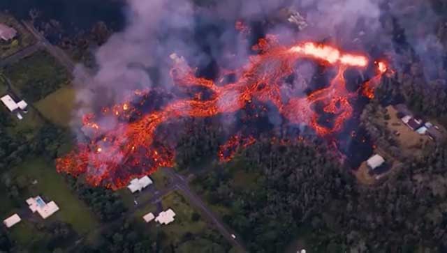 La vidéo, ci-dessous, a été filmée ce lundi matin. Elle montre des coulées de lave, suite à l'éruption du volcan Kilauea, qui se répandent dans un quartier de Leilani Estates, détruisant tout sur leur passage :