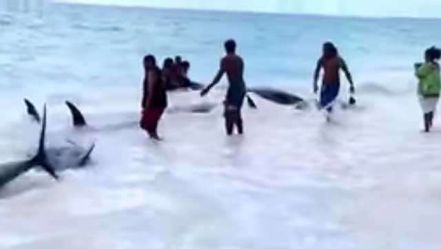 Plus d'une vingtaine de cétacés se sont échoués, lundi matin, sur la plage de Mouli, au sud d'Ouvéa. Ils ont été remis à l'eau par des habitants de la tribu, comme on le voit sur cette vidéo filmée par Benoît Wegue.
