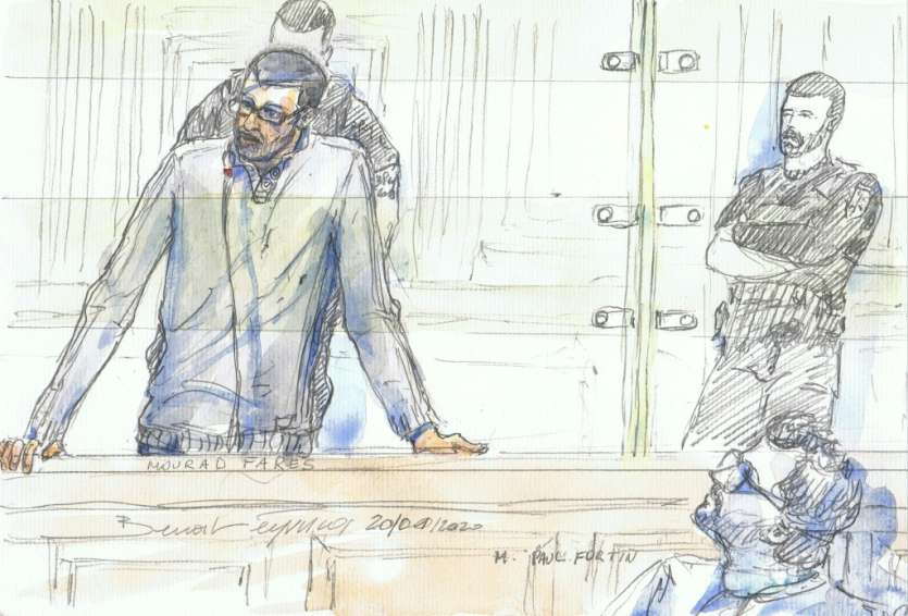 - © 2020 AFP | Crée le 25.01.2020 à 10h44 | Mis à jour le 25.01.2020 à 10h45ImprimerCroquis d'audience réalisé le 20 janvier 2020 de l'ex-recruteur jihadiste présumé Mourad Farès lors de son procès à Paris. Benoit PEYRUCQ-AFP