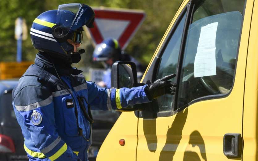 - © 2020 AFP | Crée le 05.04.2020 à 03h39 | Mis à jour le 05.04.2020 à 03h40ImprimerUn gendarme procède au contrôle d'un véhicule dans le cadre des mesures de confinement imposées dans la lutte contre le nouveau coronavirus, le 4 avril 2020 à Bénodet (Finistère) Fred TANNEAU-AFP