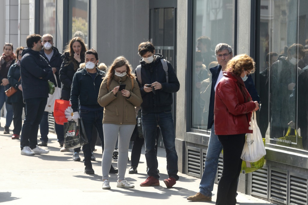 - © 2020 AFP | Crée le 29.03.2020 à 13h08 | Mis à jour le 29.03.2020 à 13h10ImprimerUne file d'attente devant l'entrée d'un supermarché le 28 mars 2020 à Paris Ludovic MARIN-AFP
