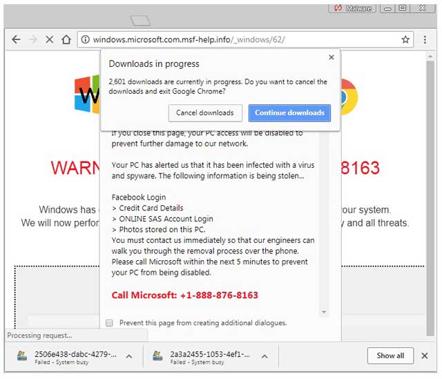 Afin de vous inciter à appeler un (faux) numéro Microsoft, évidemment payant et surtaxé, le malware va « geler » votre navigateur en lançant des centaines de téléchargements et bloquer votre ordinateur à l’aide d’un dangereux code javascript, indique le site spécialisé Malwarebytes Lab.