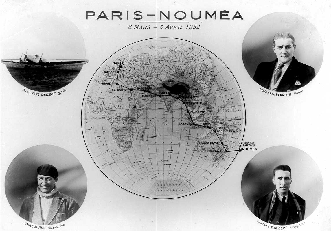 1932, l'exploit du Paris-Nouméa ; le 04/05/2012 - 02:36C'est à bord du Couzinet 33, que Charles de Verneilh, Emile Munch et Max Devé réaliseront la première liaison aérienne Paris-Nouméa.