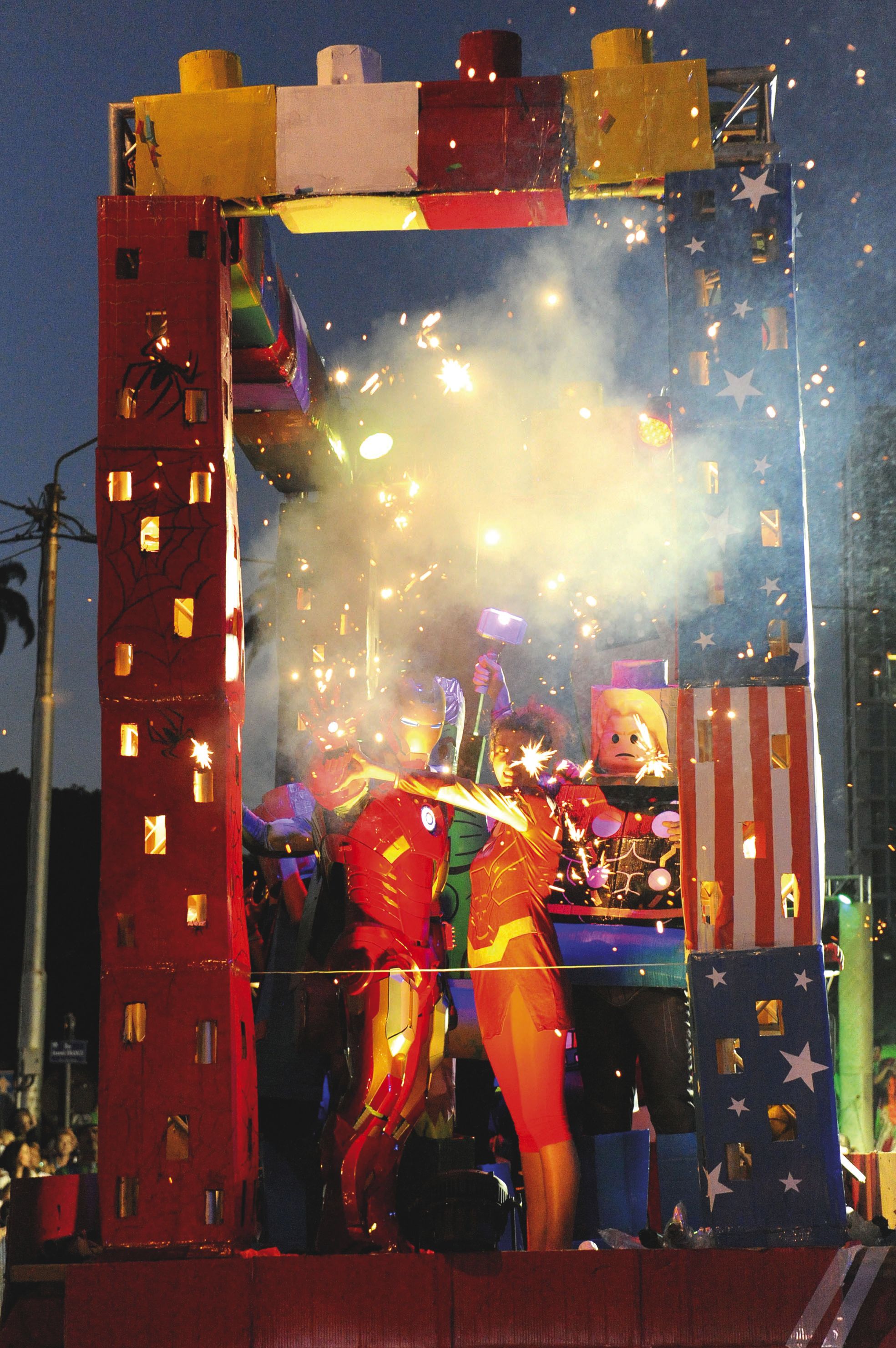 Les Lego ont inspiré plusieurs troupes, comme ce char, mélange de différents univers, qui mettait à l’honneur les superhéros.