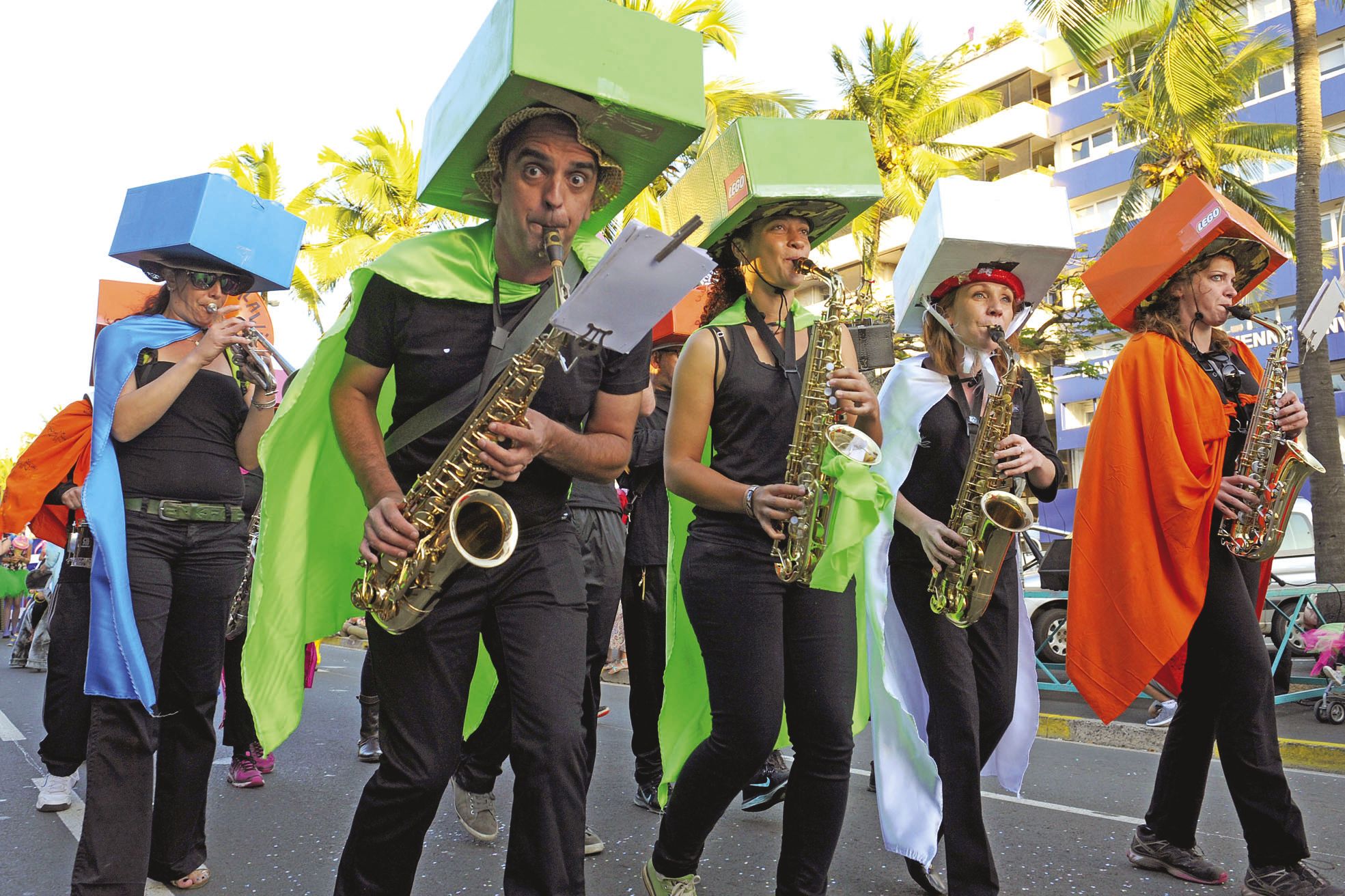 Comme l’année dernière, la fanfare Malawi a ouvert le bal, entraînant les troupes dans son sillage de bonne humeur. Les musiciens ont coiffé d’imposant Lego en guise de chapeaux.