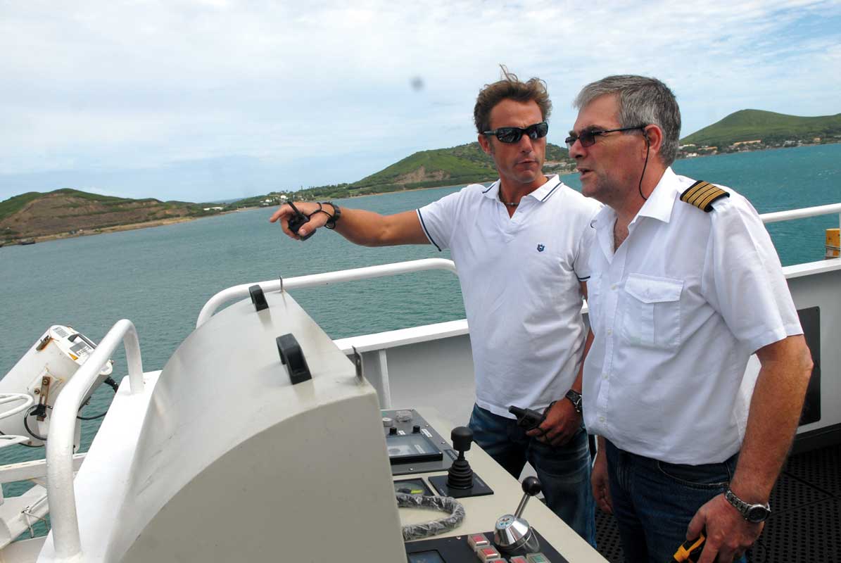 A bord de la pilotine du port ; le 05/16/2012 - 21:17A peine à bord du porte-conteneurs, Emmanuel Cardon, pilote chargé de guider le commandant au port prend la direction des opérations mais sans jamais toucher la barre.Photo : Thierry Perron