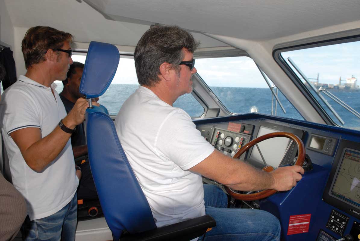 A bord de la pilotine du port ; le 05/16/2012 - 21:18A peine à bord du porte-conteneurs, Emmanuel Cardon, pilote chargé de guider le commandant au port prend la direction des opérations mais sans jamais toucher la barre.Photo : Thierry Perron