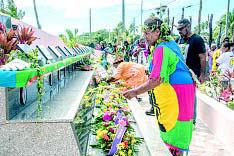 Avant de quitter Iaaï, le président s’est livré à son classique bain de foule et à une série de selfies. Au centre : le président aux côtés de la nièce de Djubelly Wéa, Christine Houkanou, et de Marie-Claude Tjibaou. A droite : à l’issue des dépôts de gerbe officiels, de nombreuses personnes venues de tout le pays se sont recueillies devant le mémorial des 19 de Hwadrilla.