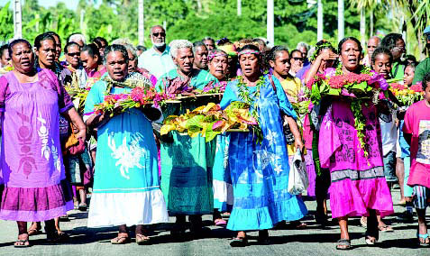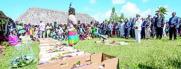 La coutume avec les officiels à la chefferie de Hwadrilla. A droite : l’émotion dominait lors des nombreux dépôts de gerbe devant le mémorial des 19.