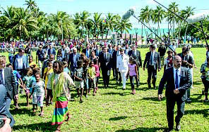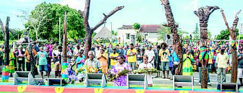 Pendant que le président se recueillait sur la stèle en mémoire des gendarmes à la brigade de Fayaoué (à droite), un cortège composé des différentes délégations prenait la direction de la chefferie de Hwadrilla, avec les familles des 19 militants en tête.