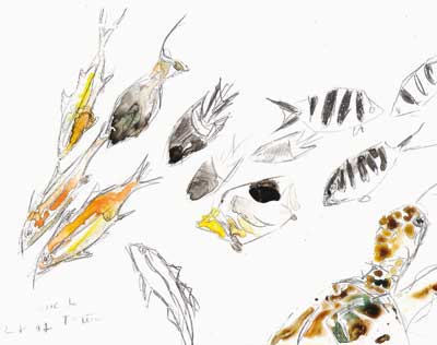 Aquarelles aquatiques ; le 09/27/2012 - 11:12C'est aussi sous l'eau que l'artiste croque les fonds marins et qu'elle a eu la chance de croiser les baleines.